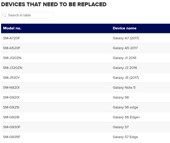 மாற்றப்பட வேண்டிய சாதனங்களின் முழுப் பட்டியலைக் கீழே உள்ள அட்டவணையில் காண்க.