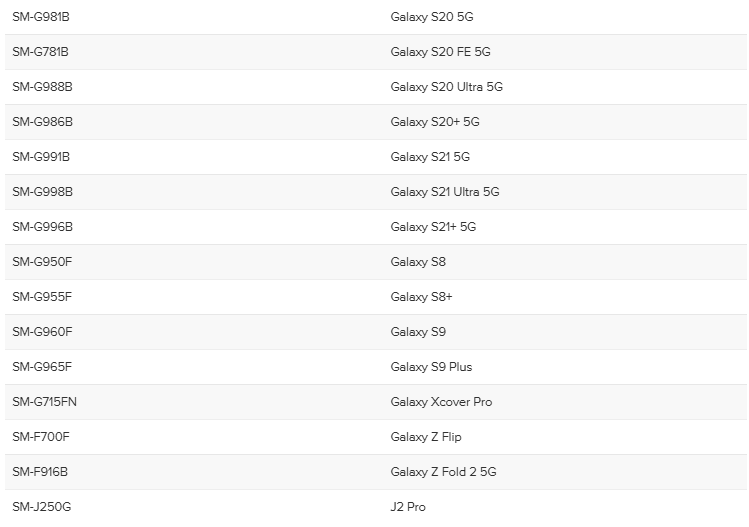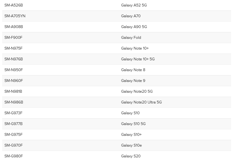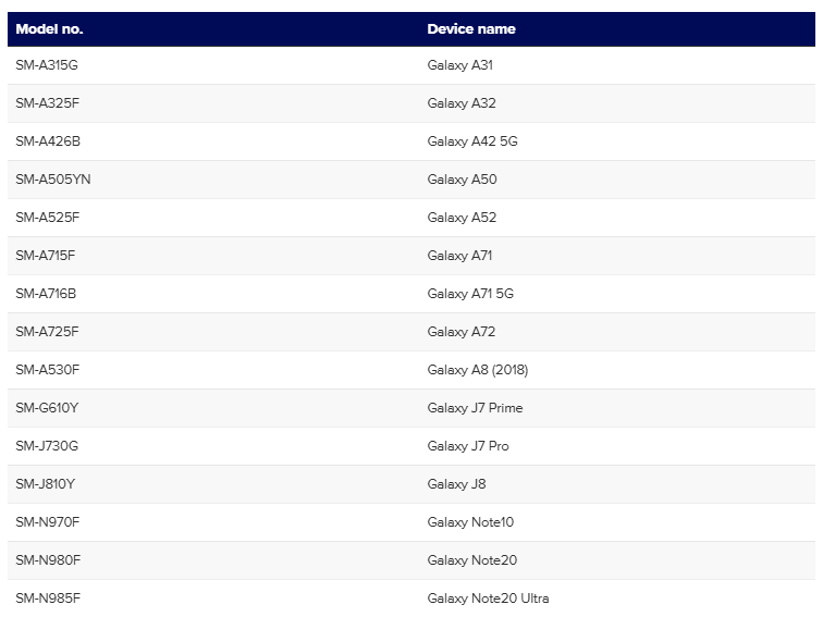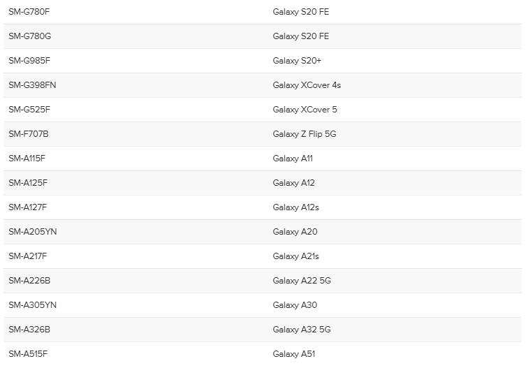 மென்பொருள் புதுப்பிப்பு தேவைப்படும் சாதனங்களின் முழுப் பட்டியலைக் கீழே உள்ள அட்டவணையில் காண்க.
