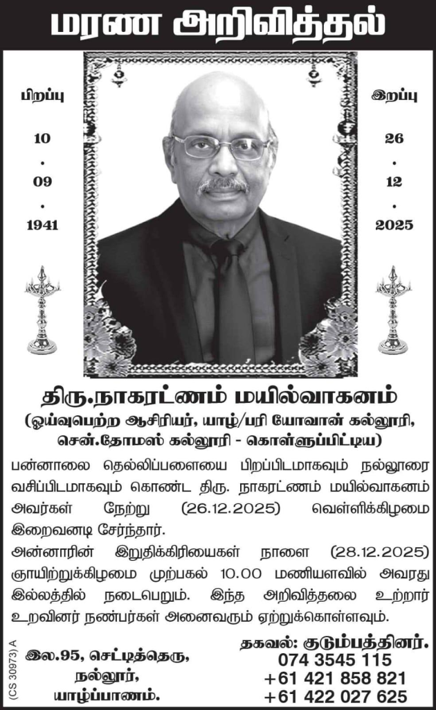 மரண அறிவித்தல் – திரு. நாகரட்ணம் மயில்வாகனம்