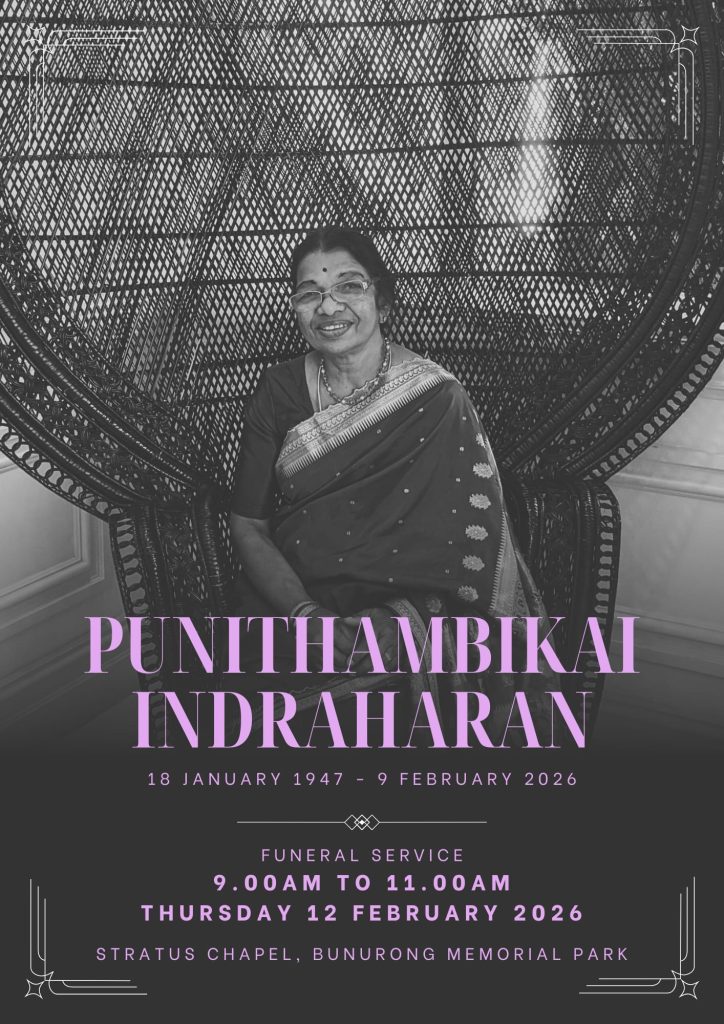 Funeral service for Punithambikai Indraharan will be held on Thursday, 12 February 2026 from 9am to 11am at the Stratus Chapel, Bunurong Memorial Park. All who knew and loved her are welcome.